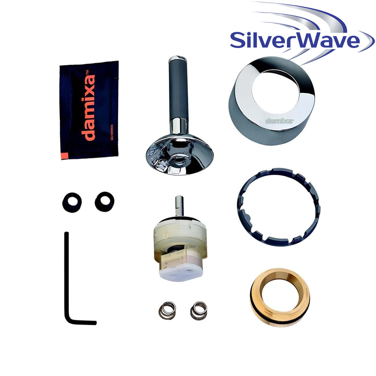 В комплект входит: картридж керамический, ключ (шестигранник), прокладки и пружинки, ручка хромированная, крышка, латунная гайка, пластмассовое крепежное кольцо.